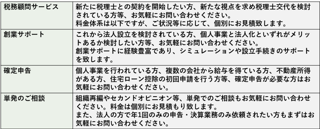 当事務所では、以下のような税務サービスを提供しておりますが、下記以外の事項についてもお気軽にお問い合わせください。