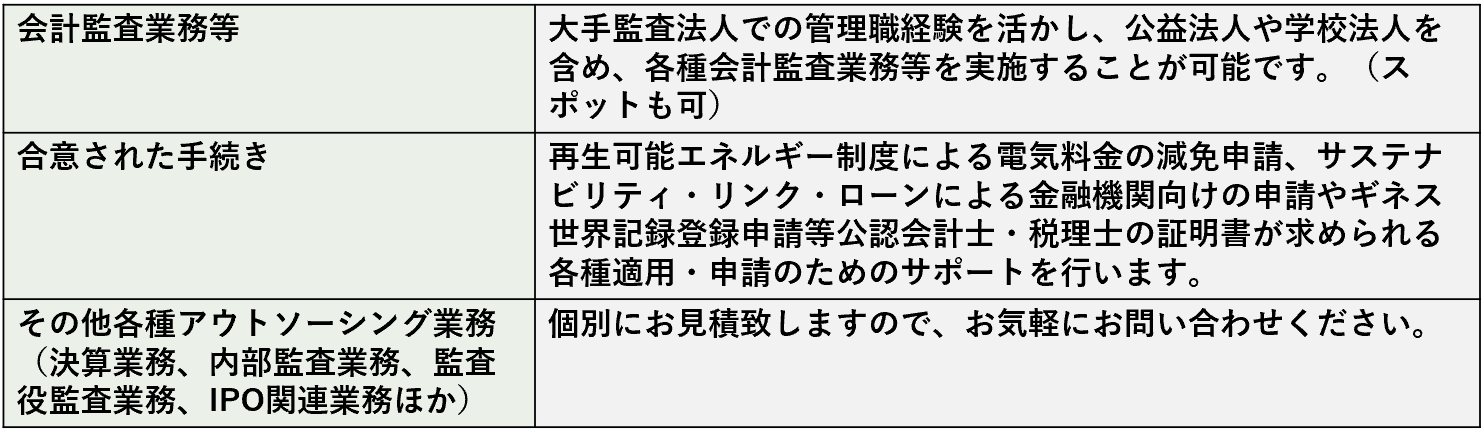 当事務所では税務相談や税務申告などの税理士業務だけではなく、公認会計士として、大企業、金融機関、官公庁、公的機関向けの監査・コンサルティング経験を生かした経営・資金面のアドバイスも得意であり、経営者の皆様の多くのお悩みに対応することが可能です。