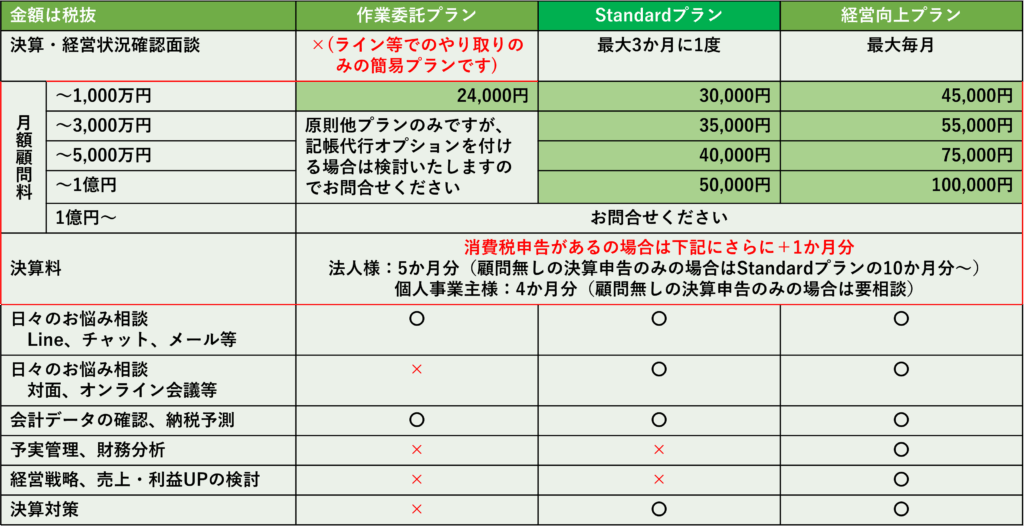 ほとんどの顧問先様は「Standardプラン」を採用頂いております。赤字決算となる見込みの場合は「作業委託プラン」、積極的な経営関与に伴う経営改善を目指したい方は「経営向上プラン」がお勧めです