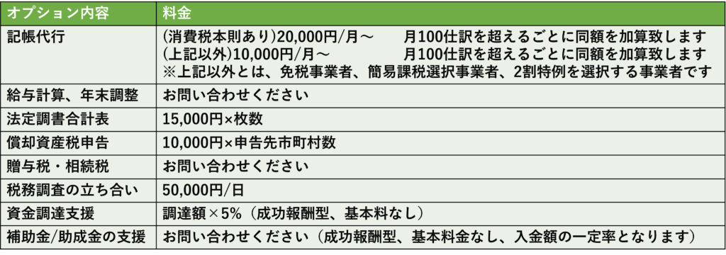 オプション価格は以下の通りですが、柔軟に対応しますので、ご不明な点はお気軽にお問い合わせください。
